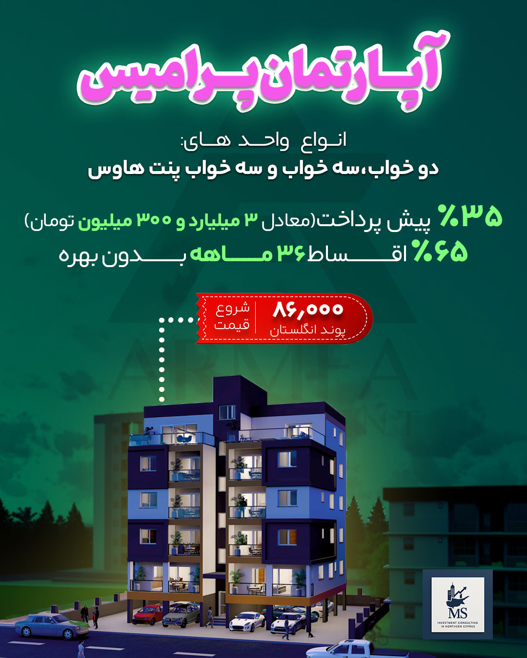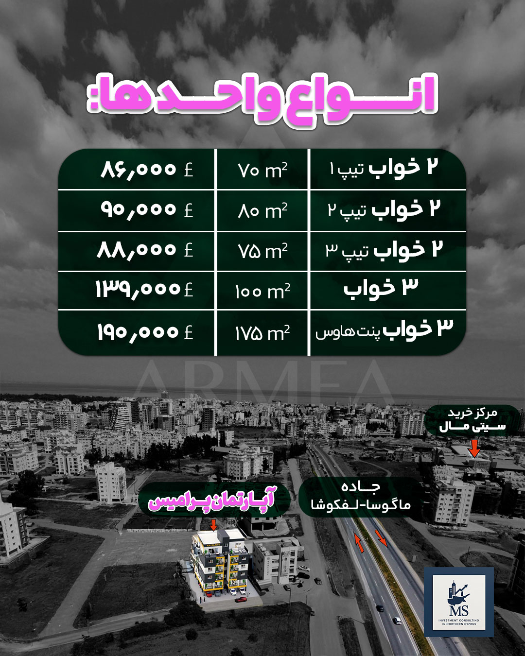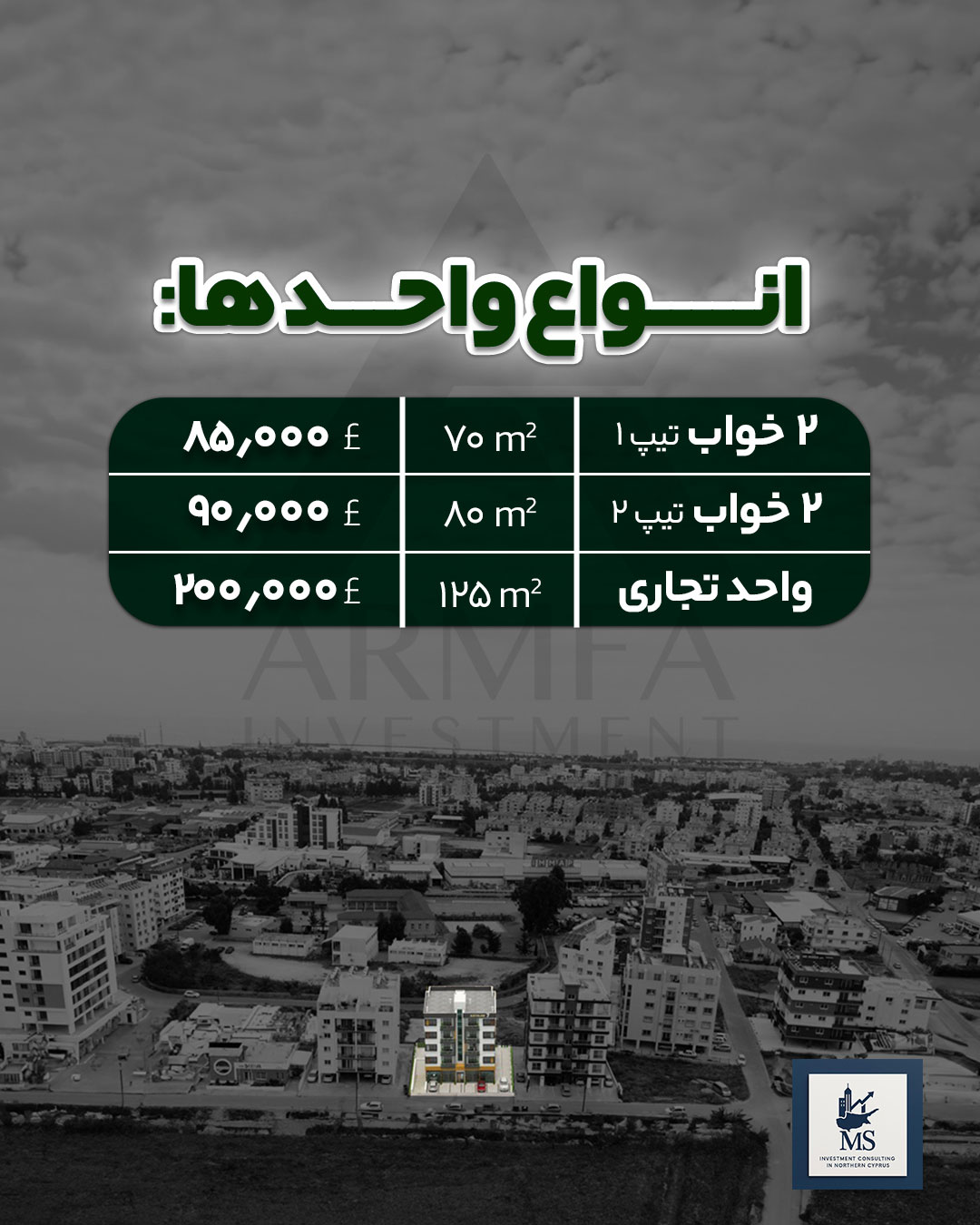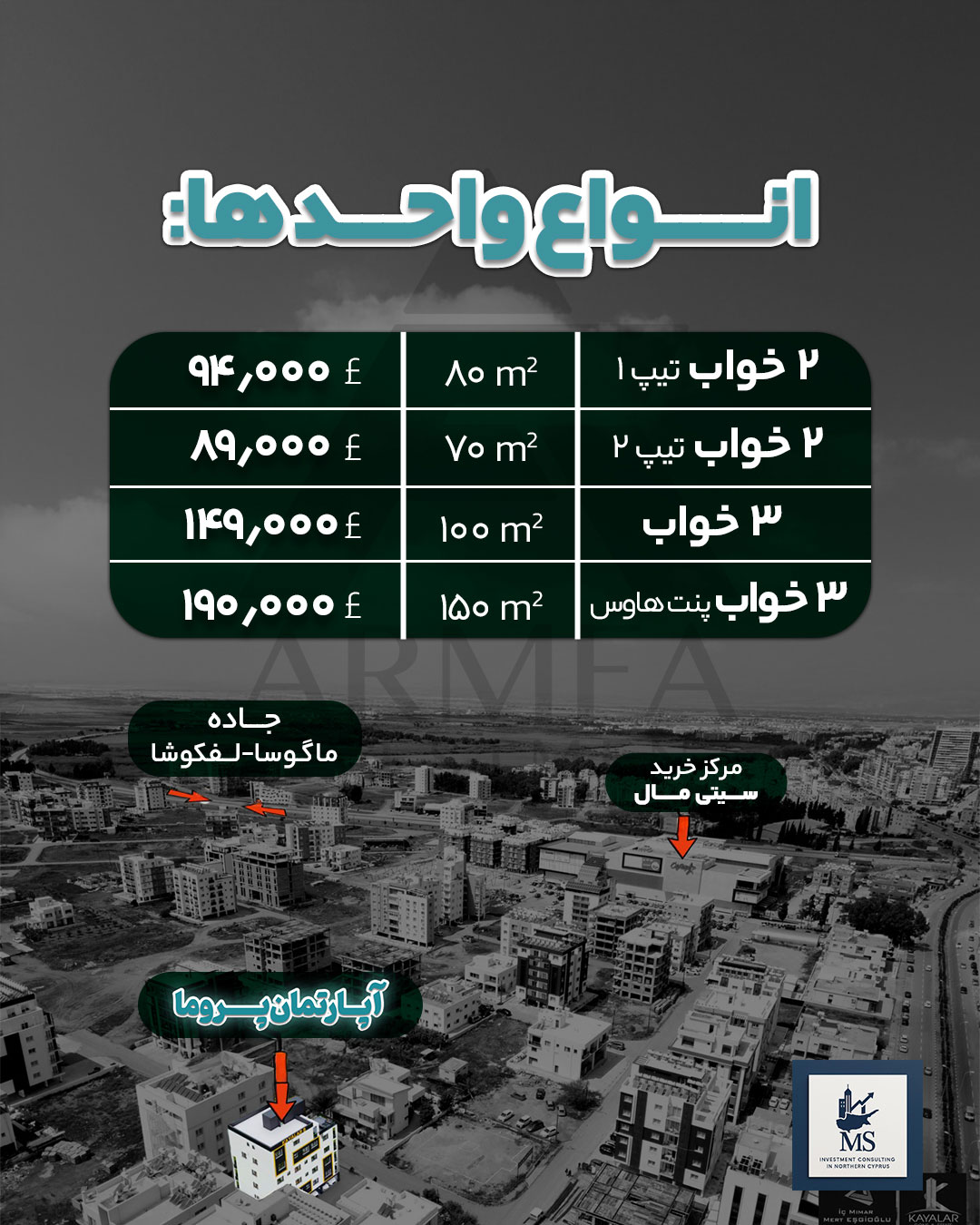 این آپارتمان که در نزدیکی جاده ماگوسا-لفکوشا و مرکز خرید سیتی مال قرار دارد ، دارای واحدهای 2 خواب ، 3 خواب و پنت هاوس از 70 تا 150 متر میباشد. شروع قیمت ها از 89.000 پوند انگلستان است و با تنها 35 درصد پیش پرداخت (معادل حدودی 3 میلیارد و 400 میلیون تومان) میتوانید اقامت قبرس شمالی را دریافت کنید.