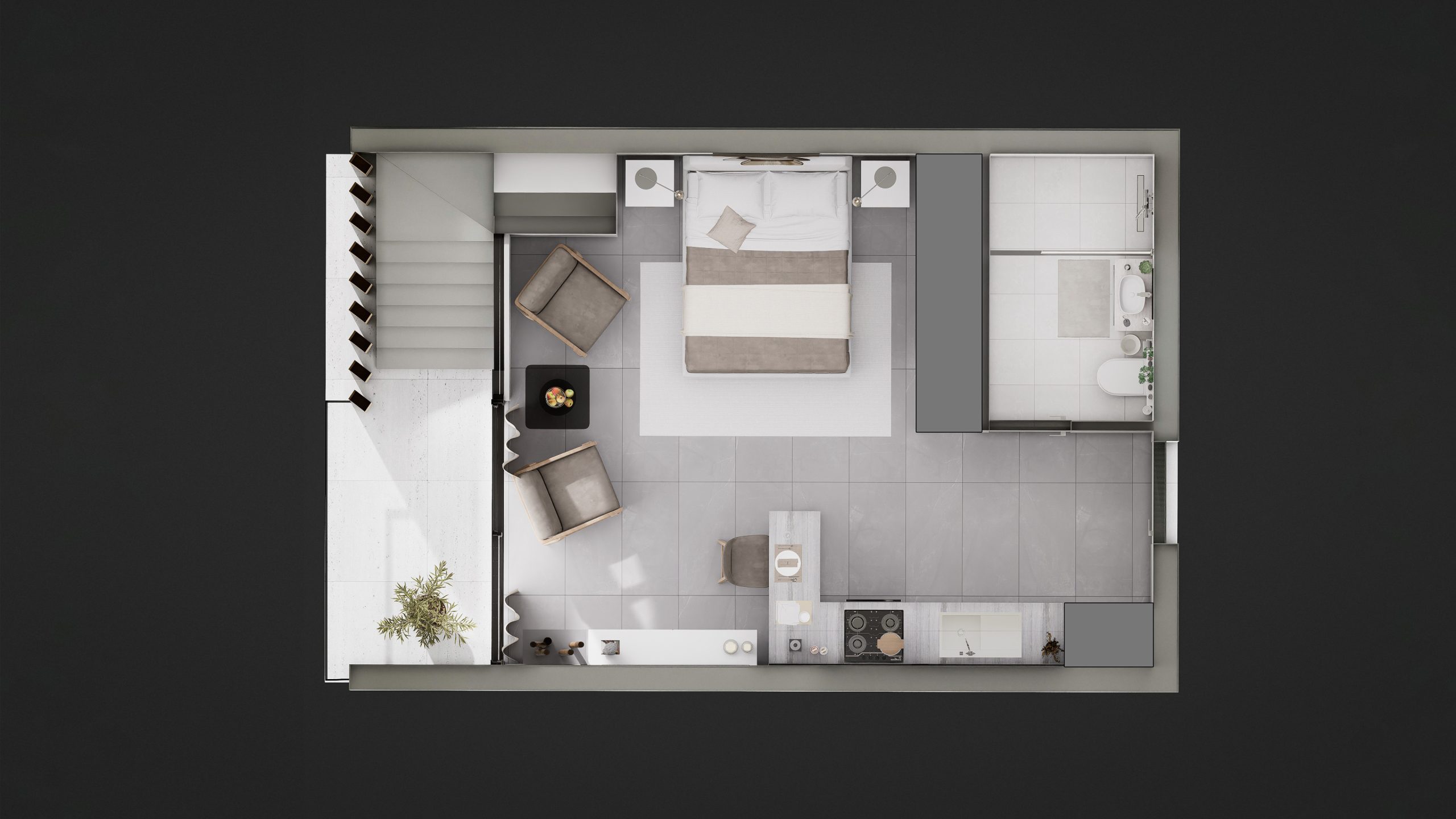 واحد استودیو نیز شامل 50 یا 45 متر مربع + 5 متر مربع بالکن + 45 متر مربع بام میباشد.