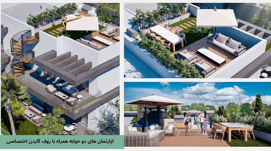 آپارتمان دو خوابه این پروژه شامل 114 متر مربع زیر بنا، 24 متر مربع تراس سرپوشیده، 70 متر باغچه اختصاصی و یا 56 متر روف گاردن اختصاصی  ساخته شده اند. طراحی بی نظیر دوبلکس، آشپزخانه ی زیبا، و اتاق خوابهای با دسترسی به تراس سرپوشیده، امکانات عالی و رفاه فوق العاده را فراهم می کنند.